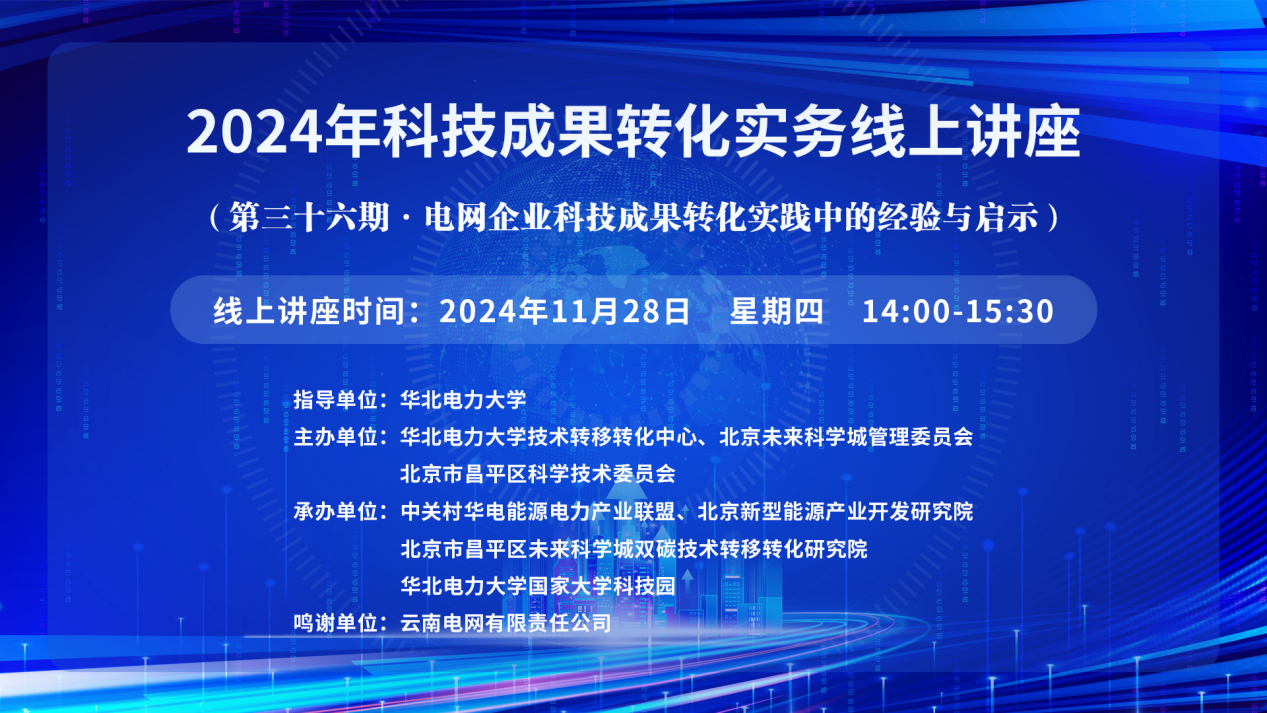 2024年科技成果轉(zhuǎn)化實(shí)務(wù)線上講座(第三十六期)【講座主題】電網(wǎng)企業(yè)科技成果轉(zhuǎn)化實(shí)踐中的經(jīng)驗(yàn)與啟示 【講座時(shí)間】11月28日 【講座地點(diǎn)】https://wlwth.xetlk.com/sl/xB9xJ 聯(lián)系人:李曉婉 13311276132 【主講人】 朱全聰 云南電網(wǎng)有限責(zé)任公司電力科學(xué)研究院成果轉(zhuǎn)化主管 【主講人簡(jiǎn)介】 朱全聰,云南...主講人:朱全聰時(shí)間:2024-11-28 14:00地點(diǎn):線上講座